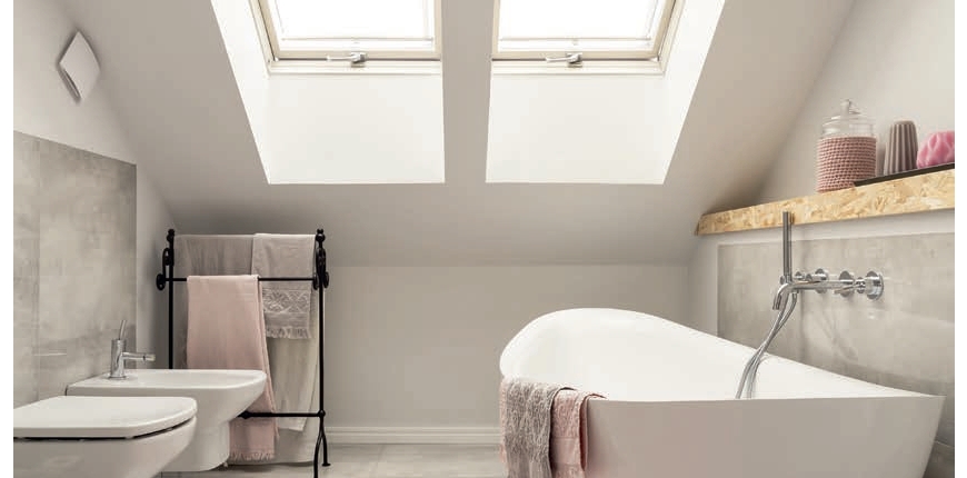 Wpływ na funkcjonalność łazienki ma również jej dobre doświetlenie. Usytuowanie na poddaszu umożliwi montaż okna dachowego. Gdy wnętrze jest małe, wystarczy jedno standardowej wielkości, w dużym warto zamontować zestaw pionowy lub poziomy. Najbardziej funkcjonalne będzie takie jego usytuowanie, by sprzęty łazienkowe nie utrudniały do niego dostępu. Położenie dolnej krawędzi na wysokości ok. 90 cm od poziomu podłogi nie będzie kolidowało z zamontowanymi pod oknem sprzętami łazienkowymi oraz umożliwi kontakt z otoczeniem. Najbardziej ergonomiczny będzie model obrotowy z górnym systemem otwierania. W przypadku wysokiej ścianki kolankowej konieczny będzie montaż okna wyżej niż 90 cm od podłogi. Wówczas bardziej funkcjonalne będzie okno z klamką zamontowaną u dołu.